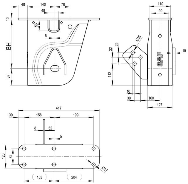ST – (eventuálně ST(BPW), BH(SAF), H(Jost)) – výška konzole od osy čepu uchycení pera/nápravy a horní přivařovací/šroubovací hranou (u šroubovací varianty se tato výška měří bez tloušťky desky na přišroubování)