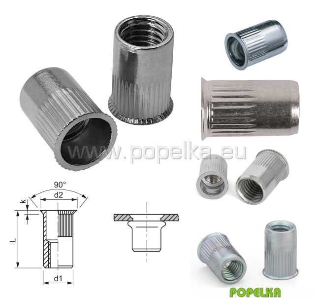 Matice nýtovací s malou zápustnou hlavou a rýhovaným tělem otevřená