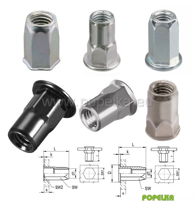 Matice nýtovací s malou zápustnou hlavou a šestihranným tělem otevřená
