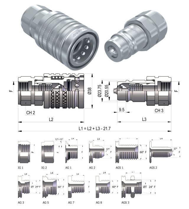 | M/M | zakončení typu matice na obou stranách, zpravidla u šroubení a hadic | ||||||
